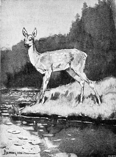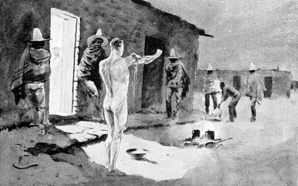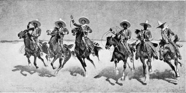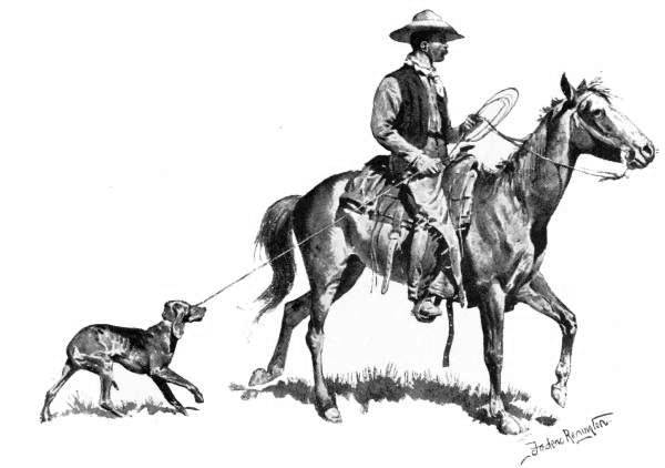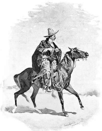 Dan, the foreman, was the huntsman. He was a shrewd-eyed, little, square-built man, always very much preoccupied with the matter in hand. He wore a sombrero modelled into much character by weather and time, a corduroy coat, and those enormous New-Mexican “chaps,” and he sounded a cow-horn for his dogs, and alternately yelped in a most amusing way. So odd was this yelp that it caught the soldiers, and around their camp-fire at night you could hear the mimicking shouts of “Oh, Rocks! eh-h-h! hooick! get down on him, Rocks; tohoot! tohoot!” We were sitting about on our horses in a little sienneca, while Dan was walking about, leading his pony and looking after his dogs.