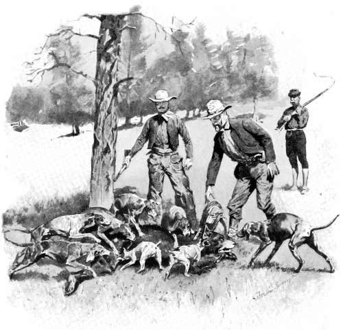 One by one the tired hunters and dogs struggled into camp all disappointed, except the dogs, which could not tell us what had befallen them since morning. The day following the dogs started a big black bear, which made a good run up a bad place in the hills, but with the hunters scrambling after in full cry. The bear treed for the dogs, but on sighting the horsemen he threw himself backward from the trunk and fell fifteen feet among the dogs, which latter piled into him en masse, the little fox-terriers being particularly aggressive. It was a tremendous shake-up of black hair and pups of all colors; but the pace was too fast for Bruin, and he sought a new tree. One little foxie had been rolled over, and had quite a job getting his bellows mended. This time the bear sat on a limb very high up, and General Miles put a .50-calibre ball through his brain, which brought him down with a tremendous thump, when the pups again flew into him, and “wooled him,” as the cowboys put it, to their hearts’ content.