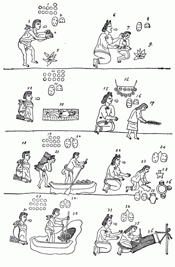 Education of the Nahua Youth—Manner of Punishment—Marriage Preliminaries—Nuptial Ceremony—Observance after Marriage—Mazatec, Otomí, Chichimec, and Toltec Marriages—Divorce—Concubinage—Ceremonies Preliminary to Childbirth—Treatment of Pregnant Women—Proceedings of Midwife—Superstitions with regard to Women who Died in Childbed—Abortion—Baptism—Speeches of Midwife—Naming of Children—Baptism among the Tlascaltecs, Mixtecs, and Zapotecs—Circumcision and Scarification of Infants240