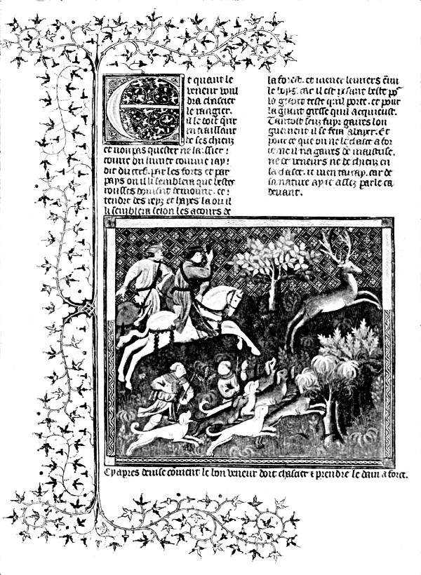 It seemed very desirable to elucidate the textual description of hunting by the reproduction of good contemporary illuminations, but unfortunately English art had not at that period reached the high state of perfection which French art had attained. As a matter of fact, only two of the nineteen English MSS. contain these pictorial aids, and they are of very inferior artistic merit. The French MSS. of La Chasse, on the other hand, are in several cases exquisitely illuminated, and MS. f. fr. 616, which is the copy from which our reproductions—much reduced in size, alas!—are made, is not only the best of them, but is one of the most precious treasures of the Bibliothèque Nationale in Paris. These superb miniatures are unquestionably some of the finest handiwork of French miniaturists at a period when they occupied the first rank in the world of art.