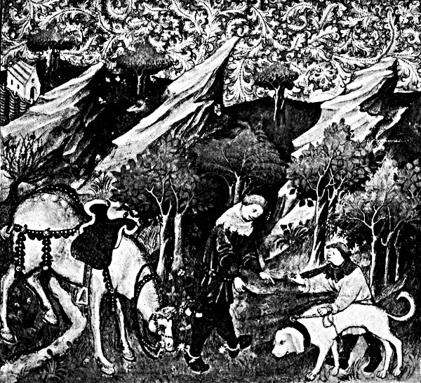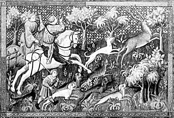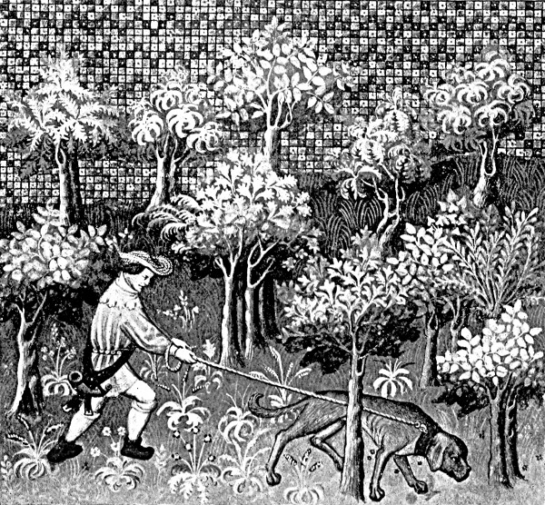 Now shall I prove how hunters live in this world more joyfully than any other men. For when the hunter riseth in the morning, and he sees a sweet and fair morn and clear weather and bright, and he [Pg 9] heareth the song of the small birds, the which sing so sweetly with great melody and full of love, each in it's own language in the best wise that it can according that it learneth of it's own kind. And when the sun is arisen, he shall see fresh dew upon the small twigs and grasses, and the sun by his virtue shall make them shine. And that is great joy and liking to the hunter's heart. After when he shall go to his quest or searching, he shall see or meet anon with the hart without great seeking, and shall harbour11 him well and readily within a little compass. It is great joy and liking to the hunter. And after when he shall come to the assembly or gathering, and he shall report before the Lord and his company that which he hath seen with his eyes, or by scantilon (measure) of the trace (slot) which he ought always of right to take, or by the fumes12 (excrements) that he shall put in his horn or in his lap. And every man shall say: Lo, here is a great hart and a deer of high meating or pasturing; go we and move him; the which things I shall declare hereafter, then can one say that the hunter has great joy. When he beginneth to hunt and he hath hunted but a little and he shall hear or see the hart start before him and shall well know that it is the right one, and his hounds that shall this day be finders, shall [Pg 10] come to the lair (bed), or to the fues (track), and shall there be uncoupled without any be left coupled, and they shall all run well and hunt, then hath the hunter great joy and great pleasure. Afterwards he leapeth on horseback, if he be of that estate, and else on foot with great haste to follow his hounds. And in case peradventure the hounds shall have gone far from where he uncoupled, he seeketh some advantage to get in front of his hounds. And then shall he see the hart pass before him, and shall holloa and rout mightily, and he shall see which hound come in the van-chase, and in the middle, and which are parfitours,13 according to the order in which they shall come. And when all the hounds have passed before him then shall he ride after them and shall rout and blow as loud as he may with great joy and great pleasure, and I assure you he thinketh of no other sin or of no other evil. And when the hart be overcome and shall be at bay he shall have pleasure. And after, when the hart is spayed14 and dead, he undoeth him and maketh his curée and enquireth or rewardeth his hounds, and so he shall have great pleasure, and when he cometh home he cometh joyfully, for his lord hath given him to drink of his good wine at the curée, and when he has come home [Pg 11] he shall doff his clothes and his shoes and his hose, and he shall wash his thighs and his legs, and peradventure all his body. And in the meanwhile he shall order well his supper, with wortes (roots) and of the neck of the hart and of other good meats, and good wine or ale. And when he hath well eaten and drunk he shall be glad and well, and well at his ease. And then shall he take the air in the evening of the night, for the great heat that he hath had. And then he shall go and drink and lie in his bed in fair fresh clothes, and shall sleep well and steadfastly all the night without any evil thoughts of any sins, wherefore I say that hunters go into Paradise when they die, and live in this world more joyfully than any other men. Yet I will prove to you how hunters live longer than any other men, for as Hippocras the doctor telleth: "full repletion of meat slayeth more men than any sword or knife." They eat and drink less than any other men of this world, for in the morning at the assembly they eat a little, and if they eat well at supper, they will by the morning have corrected their nature, for then they have eaten but little, and their nature will not be prevented from doing her digestion, whereby no wicked humours or superfluities may be engendered. And always, when a man is sick, men diet him and give him to drink water made of sugar and tysane and of such things for two or [Pg 12] three days to put down evil humours and his superfluities, and also make him void (purge). But for a hunter one need not do so, for he may have no repletion on account of the little meat, and by the travail that he hath. And, supposing that which can not be, and that he were full of wicked humours, yet men know well that the best way to terminate sickness that can be is to sweat. And when the hunters do their office on horseback or on foot they sweat often, then if they have any evil in them, it must (come) away in the sweating; so that he keep from cold after the heat. Therefore it seemeth to me I have proved enough. Leeches ordain for a sick man little meat and sweating for the terminating and healing of all things. And since hunters eat little and sweat always, they should live long and in health. Men desire in this world to live long in health and in joy, and after death the health of the soul. And hunters have all these things. Therefore be ye all hunters and ye shall do as wise men. Wherefore I counsel to all manner of folk of what estate or condition that they be, that they love hounds and hunting and the pleasure of hunting beasts of one kind or another, or hawking. For to be idle and to have no pleasure in either hounds or hawks is no good token. For as saith in his book Phœbus the Earl of Foix that noble hunter, he saw never a good man that had not pleasure in [Pg 13] some of these things, were he ever so great and rich. For if he had need to go to war he would not know what war is, for he would not be accustomed to travail, and so another man would have to do that which he should. For men say in old saws: "The lord is worth what his lands are worth."15 And also he saith in the aforesaid book, that he never saw a man tha