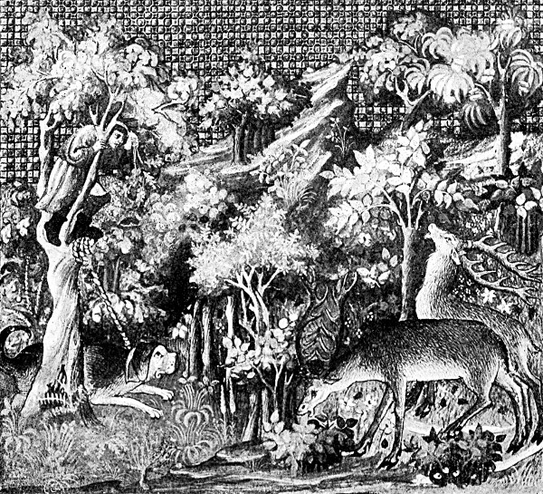 The hart is a common beast enough and therefore me needeth not to tell of his making, for there be few folk that have not seen some. The harts be the lightest (swiftest) beasts and strongest, and of marvellous great cunning. They are in their love, which men call rut, about the time of the Holy Rood28 in September and remain in their hot love a whole month and ere they be fully out thereof they abide (in rut) nigh two months. And then they are bold, and run upon men as a wild boar would do if he were hunted. And they be wonderfully perilous beasts, for with great pain shall a man recover that is hurt by a hart, and therefore men say in old saws: "after the boar the leech and after the hart the bier." For he smiteth as the stroke of the springole,29 for he has great strength in the head and the body. They slay, fight and hurt each other, when they be in rut, that is to say in their love, and they sing in [Pg 24] their language that in England hunters call bellowing as man that loveth paramour.30 They slay hounds and horses and men at that time and turn to the abbay (be at bay) as a boar does especially when they be weary. And yet have men seen at the parting of their ligging (as they start from the lair)31 that he hath hurt him that followeth after, and also the greyhounds32 and furthermore a courser. And yet when they are in rut, which is to say their love, in a forest where there be few hinds and many harts or male deer, they slay, hurt and fight with each other, for each would be master of the hinds. And commonly the greatest hart and the most strong holdeth the rut and is master thereof. And when he is well pured and hath been long at rut all the other harts that he hath chased and flemed away (put to flight) from the rut then run upon him and slay him, and that is sooth. And in parks this may be proved, for there is never a season but the greatest hart will be slain by the others not while he is at the rut, but when he has withdrawn and is poor of love. In the woods they do not so often slay each other as they do in [Pg 25] the plain country. And also there are divers ruts in the forest, but in the parks there are none but that are within the park.33 After that they be withdrawn from the hinds they go in herds and in soppes (troops) with the rascal (young lean deer) and abide in (waste) lands and in heathes more than they do in woods, for to enjoy the heat of the sun, they be poor and lean for the travail they have had with the hinds, and for the winter, and the little meat that they find. After that they leave the rascal and gather together with two or three or four harts in soppes till the month of March when they mew (shed) their horns, and commonly some sooner than others, if they be old deer, and some later if they be young deer, or that they have had a hard winter, or that they have been hunted, or that they have been sick, for then they mew their heads and later come to good points. And when they have mewed their heads they take to the strong (thick) bushes as privily as they may, till their heads be grown again, and they come into grease; after that they seek good country for meating (feeding) [Pg 26] of corn, of apples, of vines, of tender growing trees, of peas, of beans, and other fruits and grasses whereby they live. And sometimes a great hart hath another fellow that is called his squire, for he is with him and doth as he will. And so they will abide all that season if they be not hindered until the last end of August. And then they begin to look, and to think and to bolne and to bellow and to stir from the haunt in which they have (been) all the season, for to go seek the hinds. They recover their horns and are summed of their tines as many as they shall have all the year between March when they mewed them to the middle of June; and then be they recovered of their new hair that men call polished and their horns be recovered with a soft hair that hunters call velvet at the beginning, and under that skin and that hair the horn waxes hard and sharp, and about Mary Magdalene day (July 22) they fray their horns against the trees, and have (rubbed) away that skin from their horns and then wax they hard and strong, and then they go to burnish and make them sharp in the colliers places (charcoal pits) that men make sometimes in the great groves. And if they can find none they go against the corners of rocks or to crabbe tree or to hawthorn or other trees.34 [Pg 27]