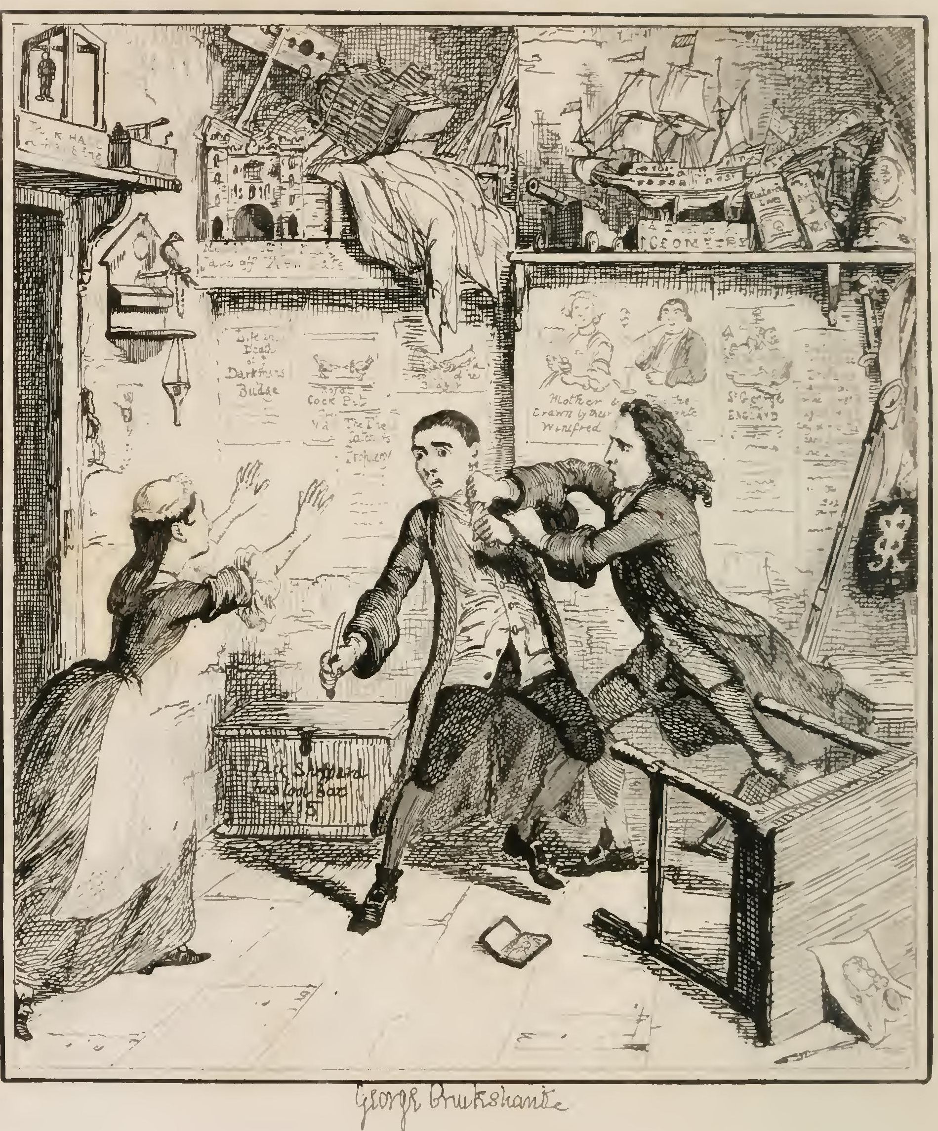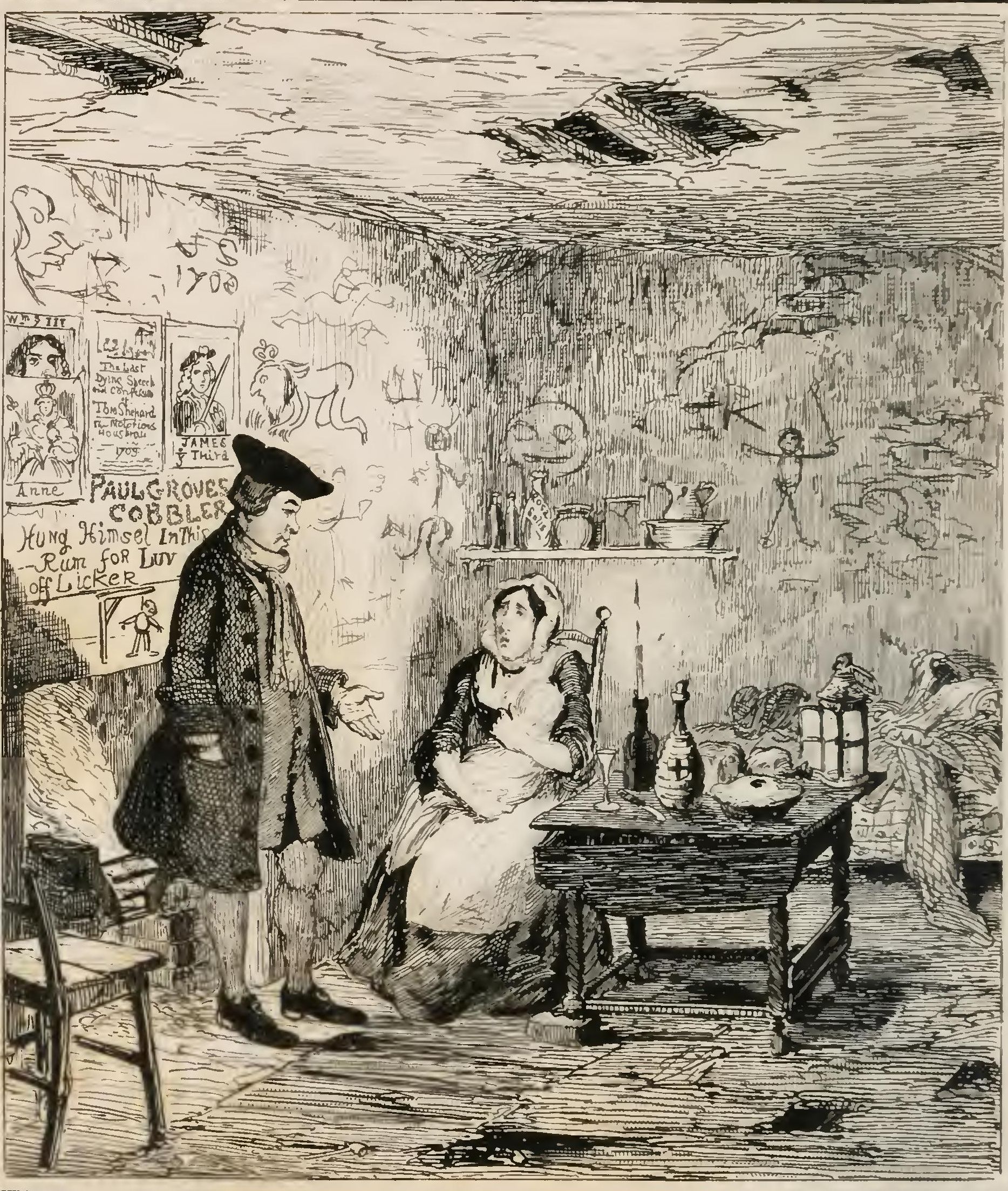 Beneath these prints, a cluster of hobnails, driven into the wall, formed certain letters, which, if properly deciphered, produced the words, “Paul Groves, cobler;” and under the name, traced in charcoal, appeared the following record of the poor fellow's fate, “Hung himsel' in this rum for luv off licker;” accompanied by a graphic sketch of the unhappy suicide dangling from a beam. A farthing candle, stuck in a bottle neck, shed its feeble light upon the table, which, owing to the provident kindness of Mr. Wood, was much better furnished with eatables than might have been expected, and boasted a loaf, a knuckle of ham, a meat-pie, and a flask of wine.