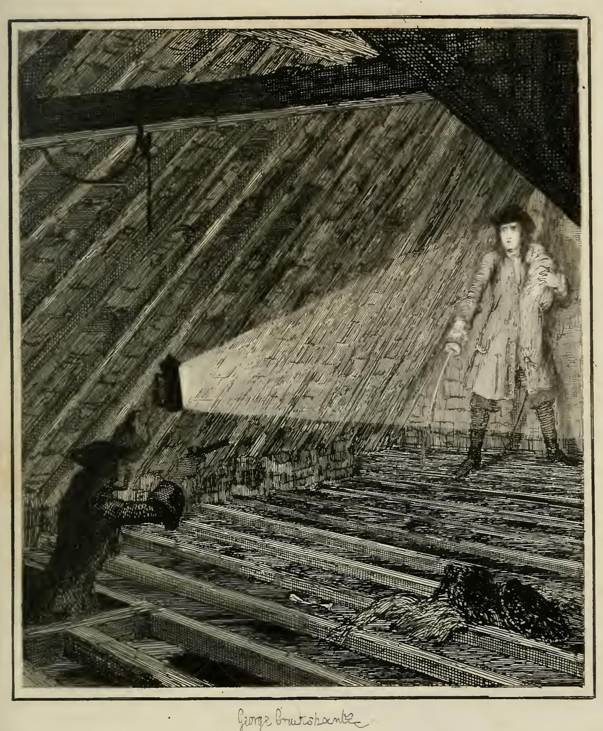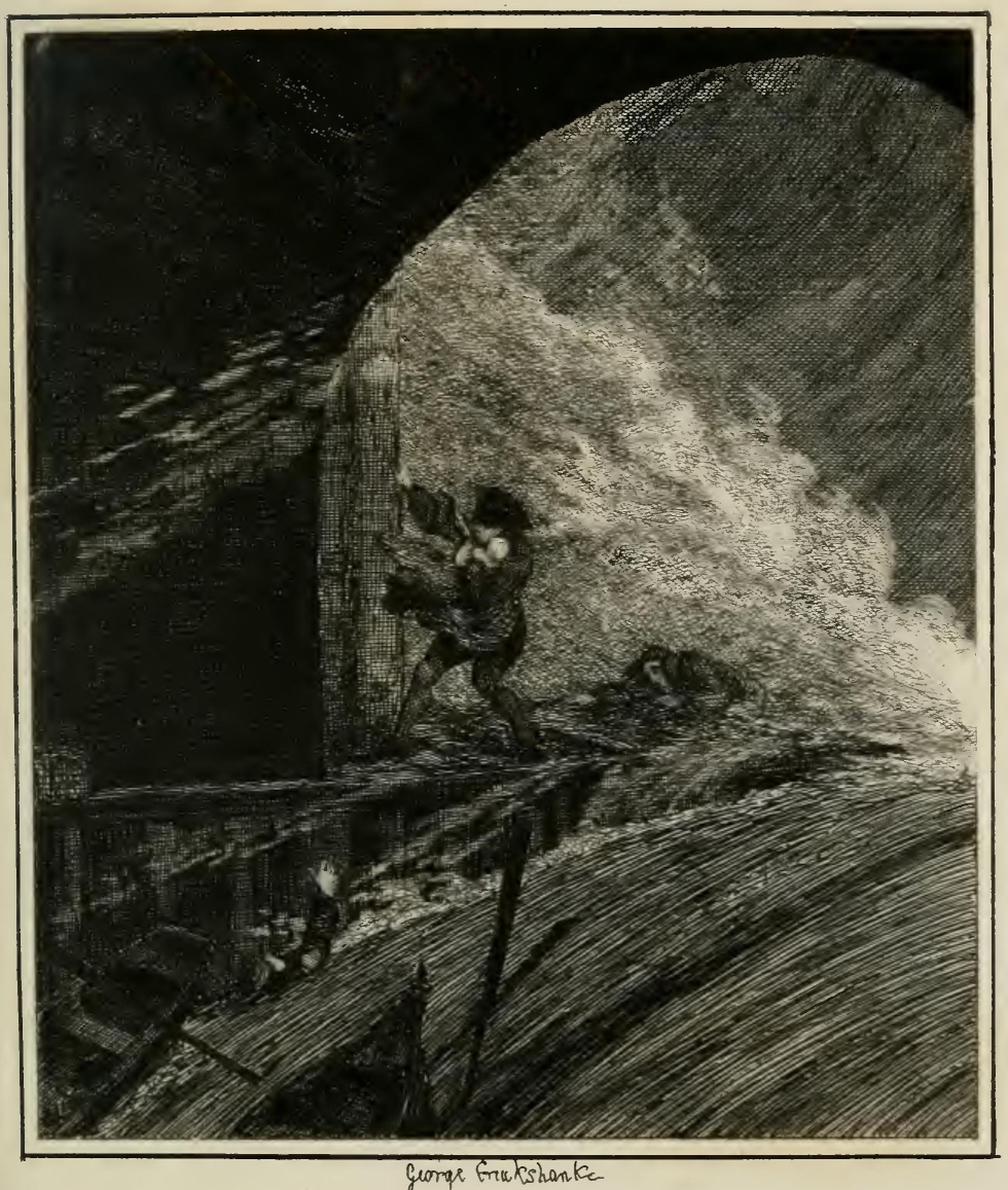 Sheppard, meanwhile, whose hands were at liberty, managed to possess himself, unperceived, of the spike of a halbert, which was lying, apart from the pole, upon a bench near him. Having secured this implement, he burst from his conductor, and, leaping into the hatch, as clowns generally spring into the clock-faces, when in pursuit of harlequin in the pantomime,—that is, back foremost,—broke into a fit of loud and derisive laughter, kicking his heels merrily all the time against the boards. His mirth, however, received an unpleasant check; for Abraham, greatly incensed by his previous conduct, caught him by the legs, and pushed him with such violence into the hole that the point of the spike, which he had placed in his pocket, found its way through his clothes to the flesh, inflicting a slight, but painful wound. Jack, who had something of the Spartan in his composition, endured his martyrdom without flinching; and carried his stoical indifference so far, as even to make a mocking grimace in Sharples's face, while that amiable functionary thrust Thames into the recess beside him.