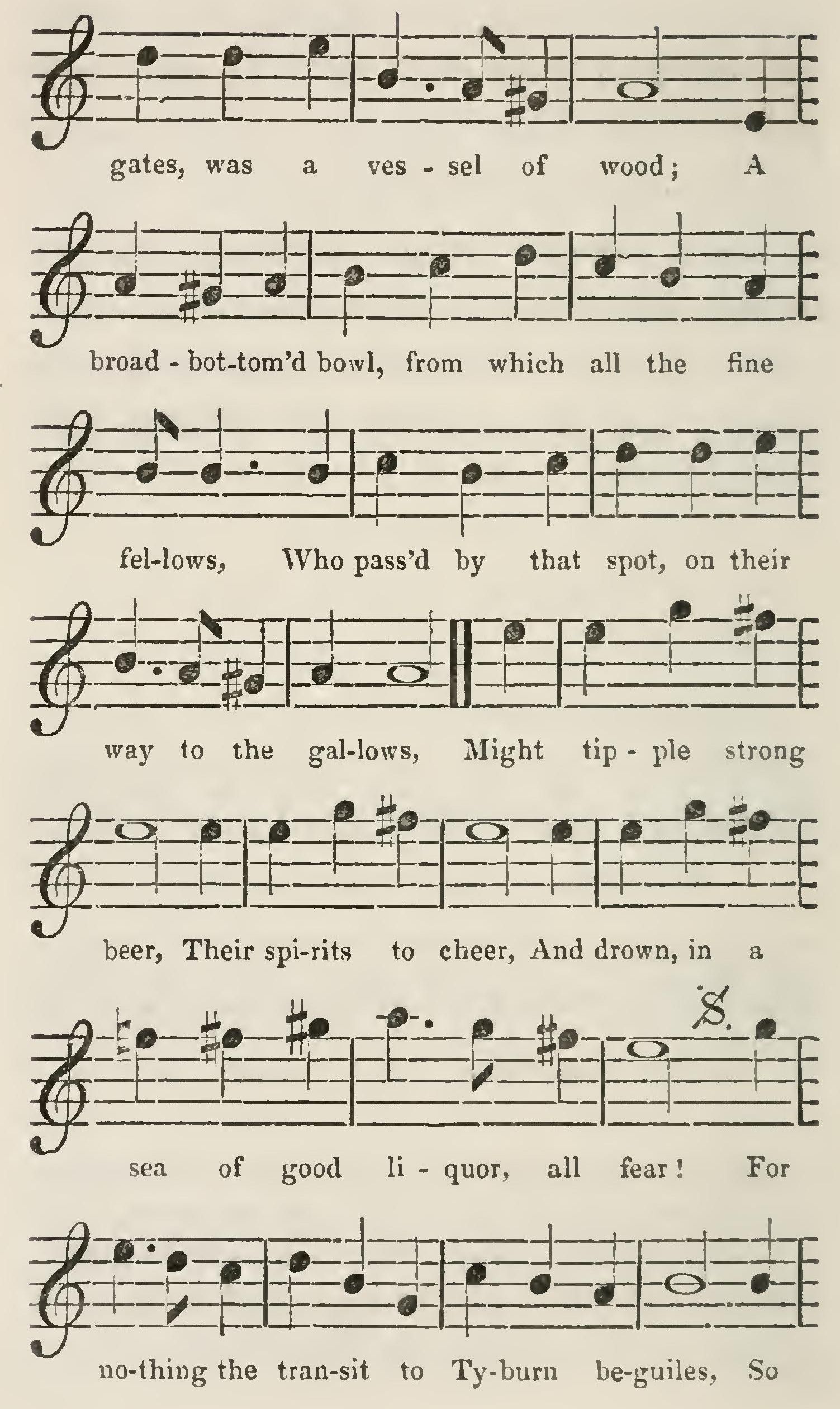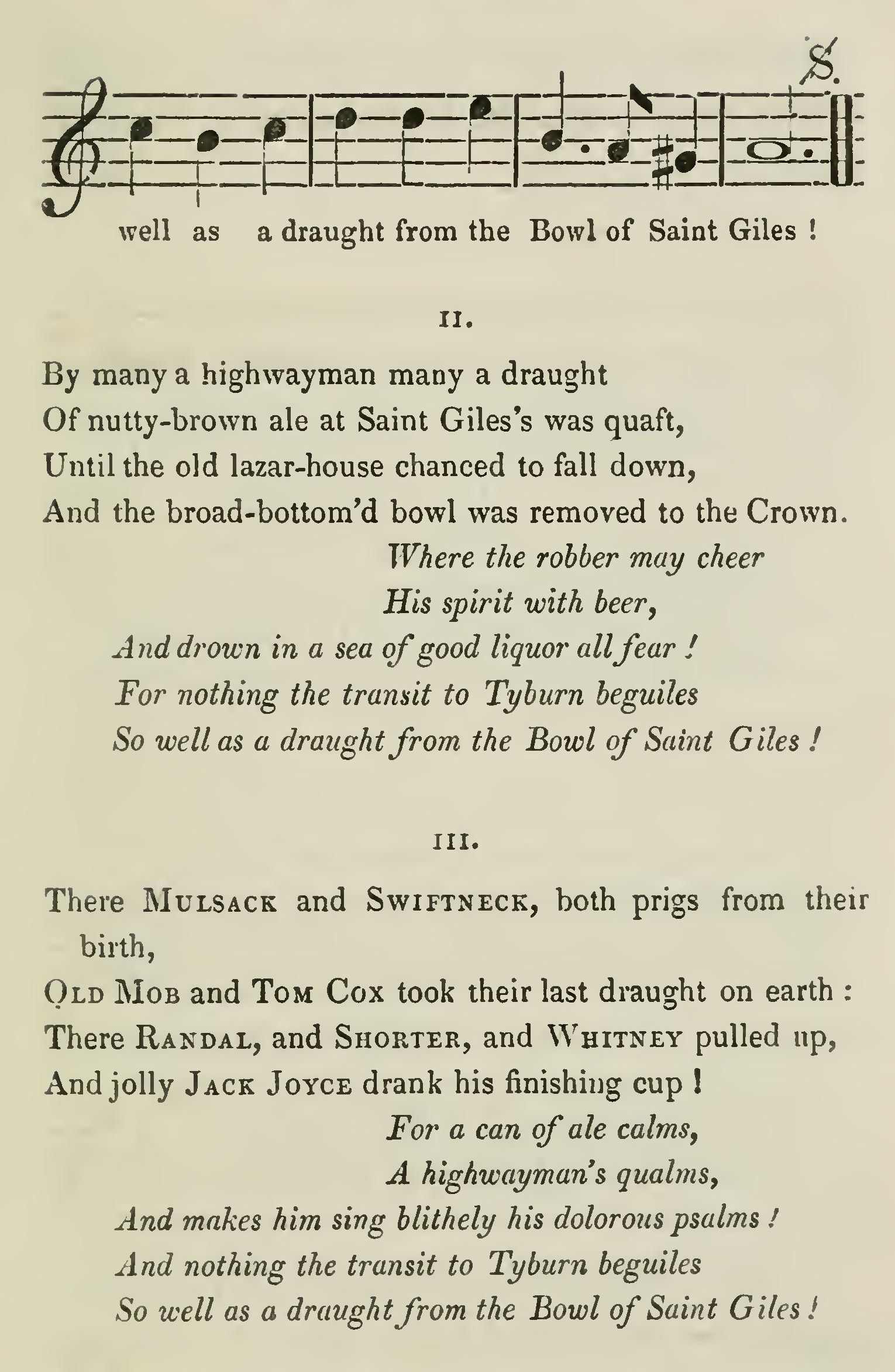 With pipe and punch upon the board, And smiling nymphs around us; No tavern could more mirth afford Than old Saint Giles's round-house! The round-house! the round-house! The jolly—jolly round-house!