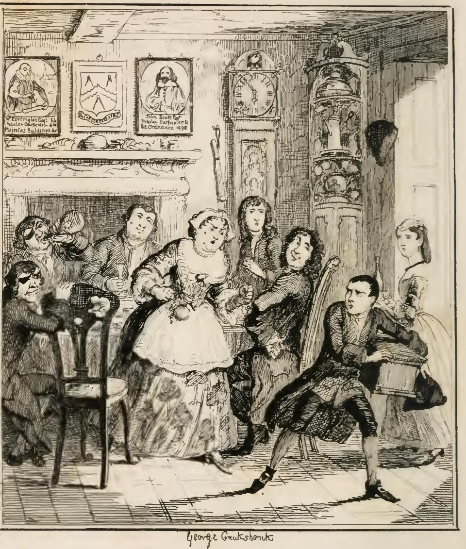 On the night of Friday, the 26th of November, 1703, and at the hour of eleven, the door of a miserable habitation, situated in an obscure quarter of the Borough of Southwark, known as the Old Mint, was opened; and a man, with a lantern in his hand, appeared at the threshold. This person, whose age might be about forty, was attired in a brown double-breasted frieze coat, with very wide skirts, and a very narrow collar; a light drugget waistcoat, with pockets reaching to the knees; black plush breeches; grey worsted hose; and shoes with round toes, wooden heels, and high quarters, fastened by small silver buckles. He wore a three-cornered hat, a sandy-coloured scratch wig, and had a thick woollen wrapper folded round his throat. His clothes had evidently seen some service, and were plentifully begrimed with the dust of the workshop. Still he had a decent look, and decidedly the air of one well-to-do in the world. In stature, he was short and stumpy; in person, corpulent; and in countenance, sleek, snub-nosed, and demure.