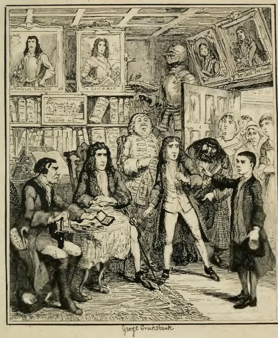 Over the chimney-piece was pasted a handbill, purporting to be “The last Dying Speech and Confession of TOM SHEPPARD, the Notorious Housebreaker, who suffered at Tyburn on the 25th of February, 1703.” This placard was adorned with a rude wood-cut, representing the unhappy malefactor at the place of execution. On one side of the handbill a print of the reigning sovereign, Anne, had been pinned over the portrait of William the Third, whose aquiline nose, keen eyes, and luxuriant wig, were just visible above the diadem of the queen. On the other a wretched engraving of the Chevalier de Saint George, or, as he was styled in the label attached to the portrait, James the Third, raised a suspicion that the inmate of the house was not altogether free from some tincture of Jacobitism.