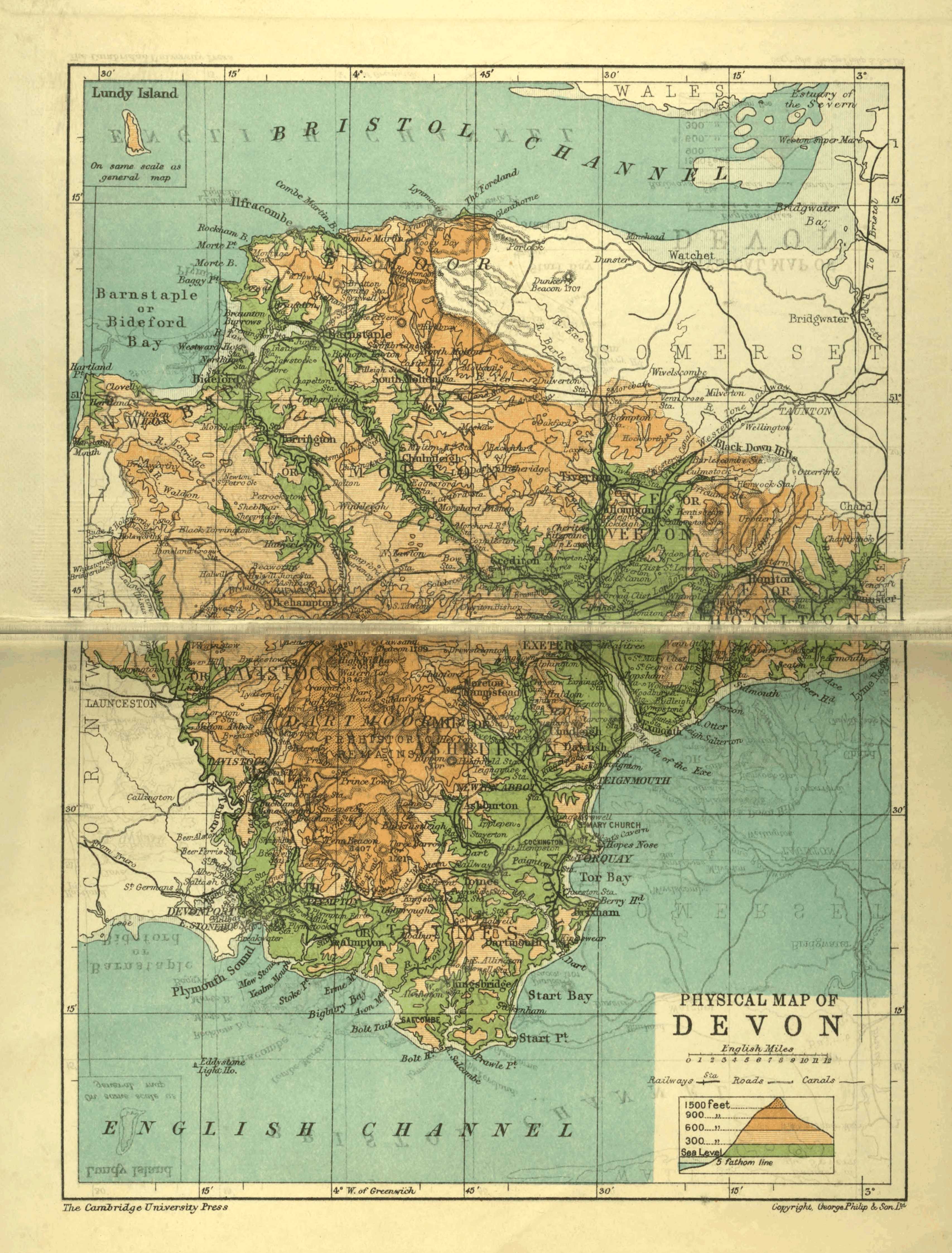 Hartland (1634), a small town in a very large but thinly-inhabited parish, stands on the west side of Hartland Point. In the church, whose lofty tower serves as a steering-mark for ships in the Bristol Channel, is one of the longest rood-screens in Devon, and also a good Norman font and door. (pp. 64, 150, 170, 172, 173, 175, 184.)