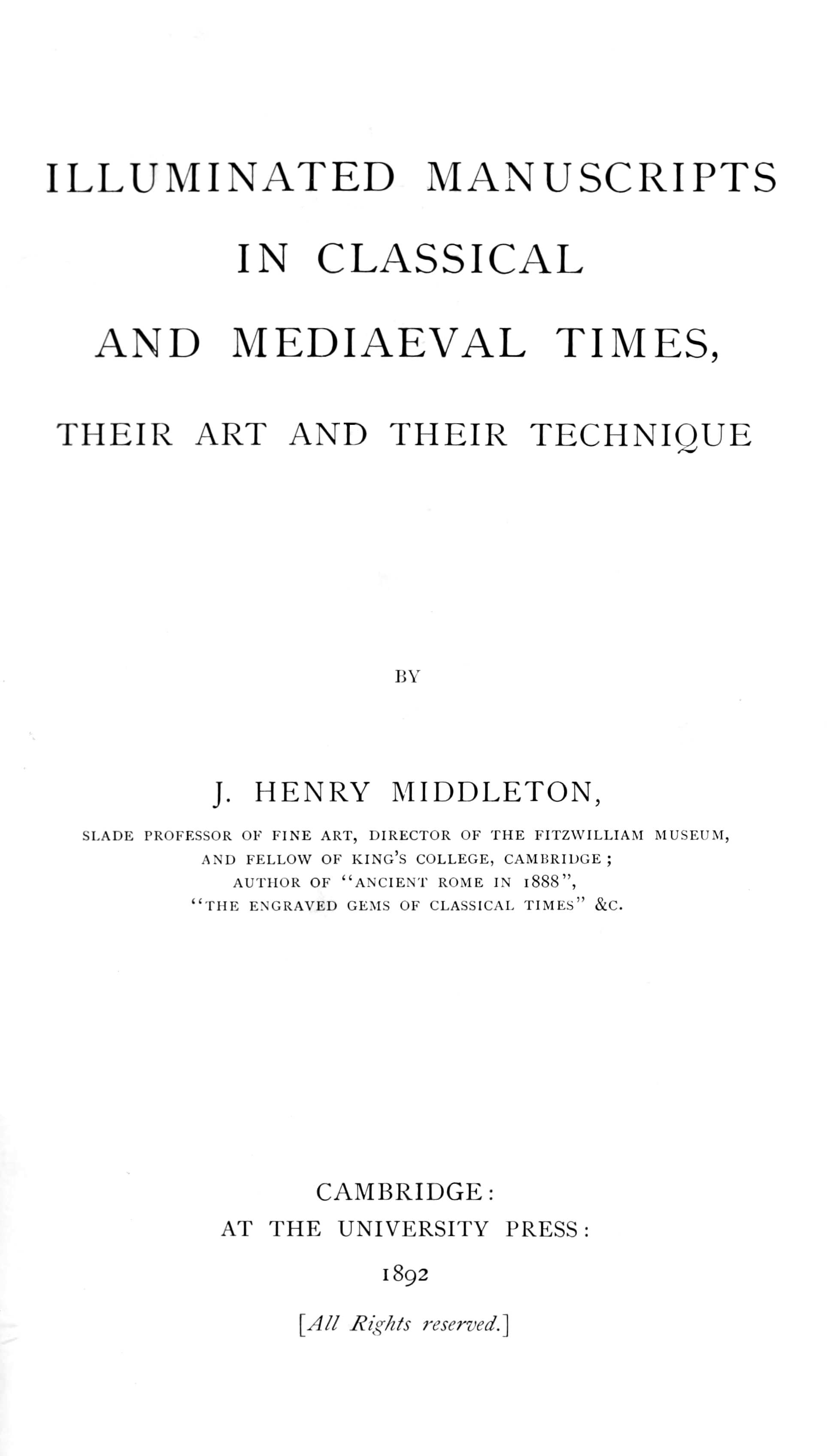 The following are the most useful and easily accessible books on the technical processes of the illuminator; Theophilus, Schedula diversarum Artium, Hendrie's edition with a translation, London, 1847; Cennino Cennini, Trattato della pittura, 1437, edited, with a translation, by Mrs Merrifield, London, 1844; and a large and valuable collection of early manuscripts on the same subject, edited and translated by Mrs Merrifield under the title of Original Treatises on the Arts of Painting, 2 Vols., London, 1849.