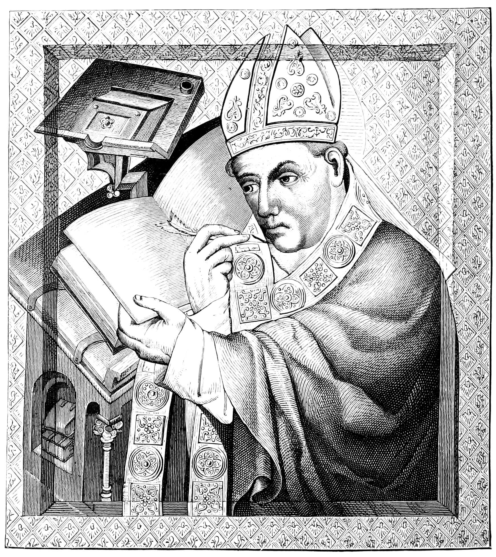 Painting on panel by a fifteenth century artist of the Prague school; it represents St Augustine as an Episcopal scribe. The background and the ornaments of the dress are stamped in delicate relief on the gesso ground and then gilt. This picture, which is now in the Vienna Gallery, was originally part of the painted wall-panelling in the Chapel of the Castle of Karlstein.
