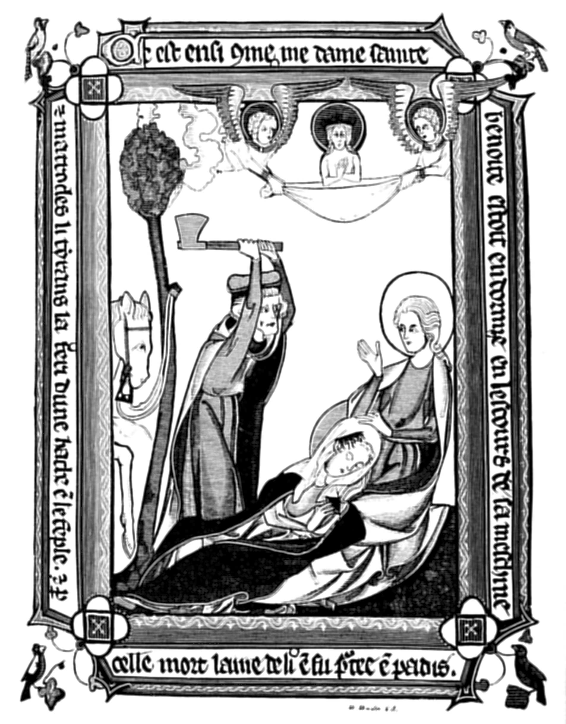 The age of Saint Louis; archaism of costume in miniatures; French manuscripts of the fourteenth and fifteenth centuries; historiated Bibles; the ivy-pattern; the Horae of the Duc de Berri; the treasure-book of Origny Abbey; the Anjou Horae; costly and magnificent French Horae; their beautiful decorations; their numerous miniatures; the Bedford Breviary; the Bedford Missal; various styles in the same manuscript; manuscripts in Grisaille; manuscripts of secular works; Cristina of Pisa; Chronicles and Travels; Romances and Poems; Italian influence in the south of France; the growth of secular illuminators; the inferiority of their work; cheap and coarsely illuminated Horae; manuscripts of the finest style; use of flowers and fruit in borders and initials; influence of the Italian Renaissance; the Horae of Jehan Foucquet of Tours.