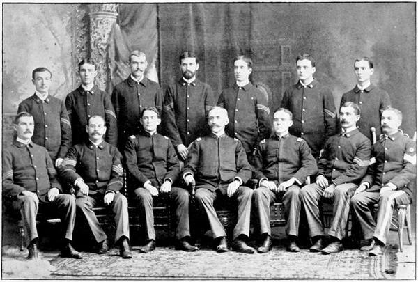 On receipt of these orders Col. Clark immediately notified his field and staff and company officers and from that time on everything at the state armory was done with a snap and a jump. Only a few days remained before May 3d, for that day fell on Tuesday, and it was Friday afternoon when the orders were received. Under the call the company strength for infantry was fixed at three officers and 74 enlisted men, but had it been 174 instead of 74 there would have been but little trouble in filling up the ranks. More men were anxious to enlist than there were places for and a hard problem for[20] the company officers to face was that of discouraging and rejecting applicants for enlistment most of whom pleaded for the privilege as strongly as a ward politician does for a paying office. On an average about 75 per cent. of the men in the militia companies enlisted in the volunteers and it is only just to state that a good number of those who did not were "talked" out of it by their officers who realized, perhaps better than the men themselves, that going to the front meant more sacrifices than men with dependent families or relatives should be called upon to make.