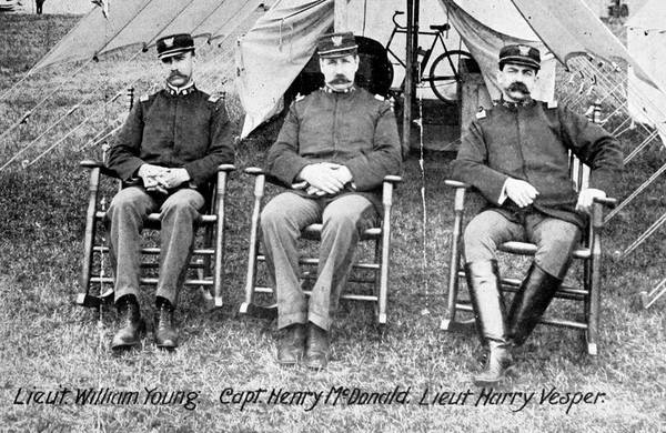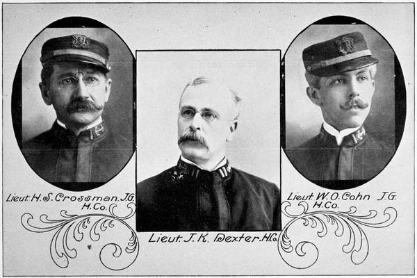 Every officer of the three companies and fully 70 per cent. of the men who had been in their ranks in the militia service was on hand. Capt. John J. Leonard of G, a veteran in the militia, was at the head of his company and with him his two lieutenants, T. A. Sweeney and E. J. Leyden. Capt. Henry McDonald of B company, a veteran both of the regular army and the militia, and his lieutenants, William L. Young and Harry J. Vesper were on hand promptly and so was Capt. W. S. Warriner and Lieutenants P. C. Powers and Harry H. Parkhurst of K company. All three companies were proud of their officers and they had every reason to be.