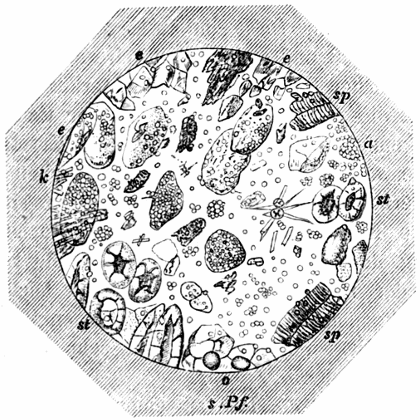 Seit ungefähr fünf Jahren hat das Mikroskop aufgehört ausschliesslich ein Instrument des Naturforschers zu sein. Es hat sich seit dieser Zeit nicht nur als ein unentbehrliches Hilfsmittel denen erwiesen, welche in ihren Berufsgeschäften in die Lage kommen, die Güte der Lebensmittel und der Waaren zu prüfen, oder welche bei ihren Studien naturwissenschaftliche Kenntnisse sammeln müssen, es hat sich sogar heutigen Tages in dem gewöhnlichen Verkehrsleben und der Hauswirthschaft unentbehrlich gemacht, indem nur durch das Mikroskop trichiniges Fleisch zu erkennen ist und wir uns damit vor der schrecklichen Trichinosis zu schützen vermögen.