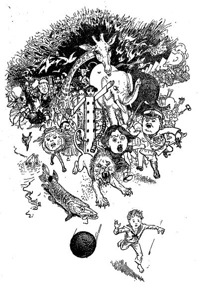 Behind him he heard a noise growing louder every minute: there were lions roaring and elephants trumpeting, and marbles rolling, and sounds of gimlets and hammers that showed the happy families were on his track, and whistles from engines, and bells ringing as if the whole village had caught fire, or was just going to have dinner; and when he came to the bridge, he heard bugles and drums in the camp, and the fat voice of the Brigadier-General giving orders. The stupid trout had put its head through the ice, and was shouting, ‘Here he comes,’ and a machine-gun began peppering away, and a huge cannon-ball flew by him. Mixed up in this he heard the canter of the spider, and the parrot sneezing, and the hoarse voice of Miss Bones shrieking ‘My papa will make cutlets of him, and I’ll eat him.’