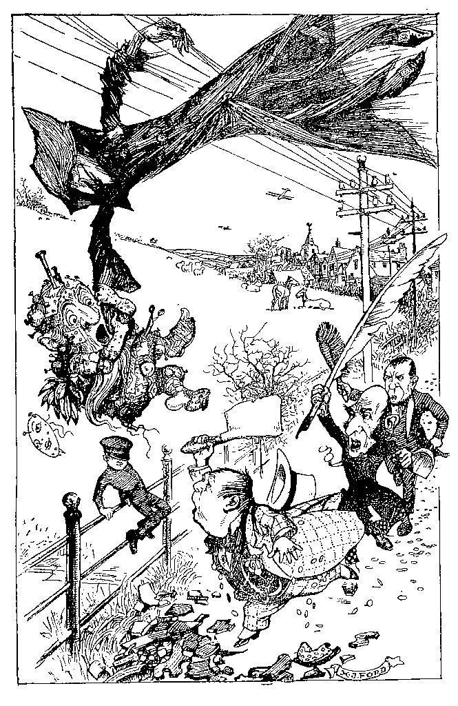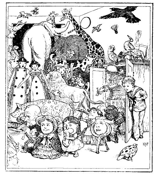 At that moment the cow’s head crashed into the wall below the window. Miss Muffet gave one faint scream, and said, ‘Spider, dear!’ Miss Bones whirled her ox-tail round her head like a sling, and, intending to hit the cow, hit Noah the most awful slap on his false whiskers, which fell off. The giraffe’s head went up the chimney with a pop and a shower of soot descended into the room.