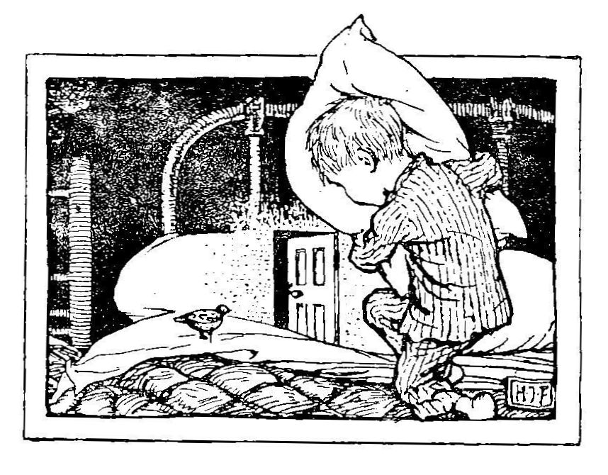 David was now quite sure that somewhere under his pillow was the door he was looking for. One time he had allowed himself to go to sleep before finding it, and the other time he had got too much awake. So on the third night he took the pin-partridge to bed with him, in the hope that it would keep him just awake enough, by pricking him with the head of its pin-leg. The pin-partridge had, of course, come out of Noah’s Ark, and in the course of some terrible adventures had lost a leg. So Nannie had taken a pin, and driven it into the stump, so that it could stand again. The pin-leg was rather longer than the wooden one, which made the partridge lean a little to one side, as if it was listening to the agreeable conversation of the animal next it.
