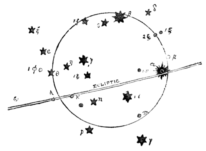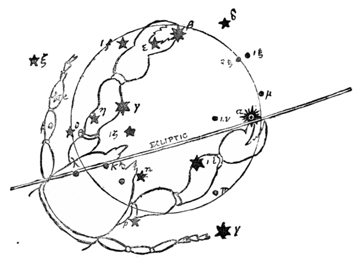 Aratus says that “some few stars of the Claws are in the (Celestial) Equator.” And Ptolemy describes the stars, now reckoned in Libra, as being in what he calls “The Constellation of the Claws.” We have reproduced them so that his description of them may be readily traced. He speaks of—