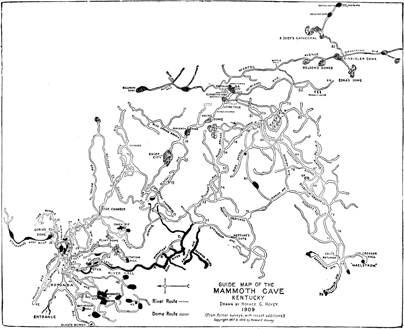 NOTE:—No instrumental survey of the whole cave has ever been made, and no exact scale can be given. The above are some of the distances as paced along the avenues. Domes, halls and pits are relatively enlarged; and rivers and pools are blackened. The data for this new Guide map is from the earlier maps of Bogert (1814), Ward (1816), Lee (1835), Bishop (1845), Blackall (1817-pub. 1899), Forwood (1875), Hovey (1887) and Call (1897), and from written and oral information by managers and guides, modified and greatly added to by the author’s own observations during the past twenty-seven years.