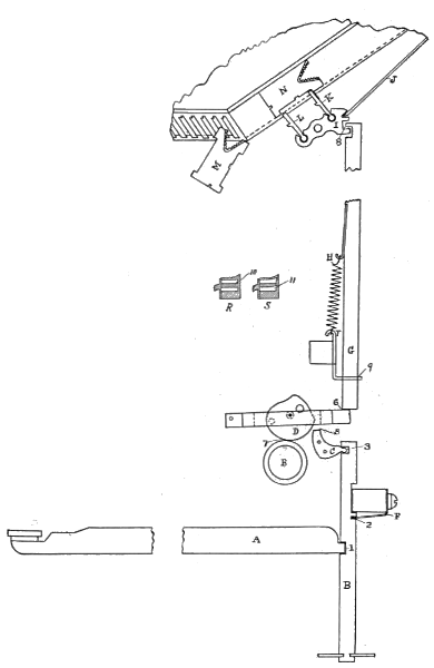 Then put on keyboard C (Fig. 6) and put in rods B (Fig. 6), which are numbered consecutively, beginning with No. 1 at the left. Then put on first elevator A (Fig. 6), distributer N (Fig. 5), and belt P (Fig. 5), which should always be crossed so as to run away from the gears.