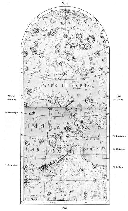 Die den Astronomen bekannte Hälfte des Mondes genügt jedoch, ihn ganz und gar bei denjenigen zu mißkreditieren, die vom Bewohnen anderer Planeten als der Erde träumen. Die Oberfläche unsres Satelliten, deren Ausdehnung zweimal so groß als Europa ist, stellt sich in den Teleskopen als eine wasserlose, wüste Hochebene dar, die mit einer ungeheuren Anzahl mächtiger, kraterähnlicher Ringberge besät ist. Diese Bergriesen, deren Gipfel sich bis zu 7000 Metern erheben, haben nicht selten einen Durchmesser von 100 Kilometern. Durch den nördlichen Teil der uns zugewandten Halbkugel zieht sich eine Reihe großer, kreisförmiger Flächen, die die ersten Selenographen „Meere“ nannten. Diese Ebenen mit steilen Ufern, die durch in den Himmel ragende Gebirgsketten gebildet werden, sind nach verschiedenen Richtungen von großen Spalten durchschnitten, deren Entstehung die Astronomen stets in Staunen versetzte, vor allem, weil auf der Erde keine ähnlichen Erscheinungen vorhanden sind. Diese Spalten, manchmal über hundert Kilometer lang und einige Kilometer breit, haben eine Tiefe von ungefähr tausend Metern und mehr.