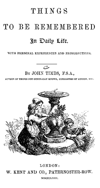 "Full of odd, quaint, out-of-the-way bits of information upon all imaginable subjects is this amusing volume, wherein Mr. Timbs discourses upon domestic, rural, metropolitan, and social life; interesting nooks of English localities; time-honoured customs, and old-world observances; and, we need hardly add, Mr. Timbs discourses well and pleasantly upon all."—Notes and Queries.