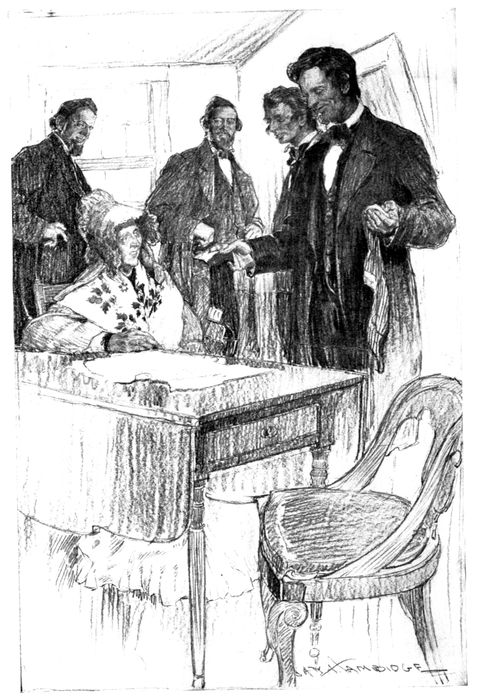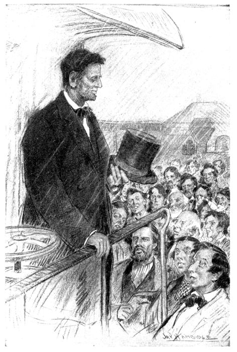 “He stood a minute lookin’ at us, and then he began to talk. There ain’t a man in this town that heard him that ever forgot what he said, but I don’t believe there’s a man that ever said it over out loud—he couldn’t, without cryin’. He just talked to us that time out of his heart. Somehow we felt all of a suddint how we 24loved him and how he loved us. We hadn’t taken any stock in all that talk about his bein’ killed, but when he said he was goin’ away not knowin’ where or whether ever he would return I just got cold all over. I begun to see that minute and everybody did. The women all fell to sobbin’ and a kind of groan went up, and when he asked us to pray for him I don’t believe that there was a man in that crowd, whether he ever went to church in his life, that didn’t want to drop right down on his marrow bones and ask the Lord to take care of Abraham Lincoln and bring him back to us, where he belonged.