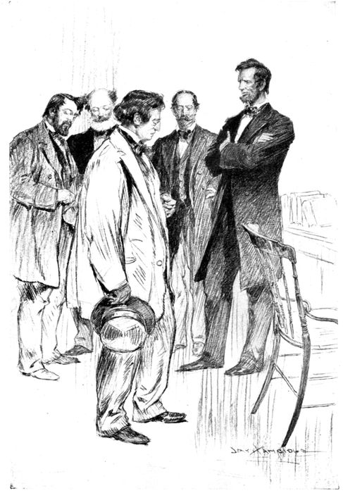 “‘Was there much talk about his bein’ killed?’ Well, there’s an awful lot of fools 20in this world and when they don’t git what they want they’re always for killin’ somebody. Mr. Lincoln never let on, but I reckon his mail was pretty lively readin’ sometimes. He got pictures of gallows and pistols and other things and lots of threats, so they said. I don’t think that worried him much. He was more bothered seein’ old Buchanan givin’ the game away. ‘I wish I could have got down there before the horse was stole,’ I heard him say onct in here, talkin’ to some men. ‘But I reckon I can find the tracks when I do git there.’ It was his cabinet bothered him most, I always thought. He didn’t know the men he’d got to take well enough. Didn’t know how far he could count on ’em. He and Judge Gillespie and one or two others was in here one day sittin’ by the stove talkin,’ and he says, ‘Judge, I wisht I could take all you 21boys down to Washington with me, Democrats and all, and make a cabinet out of you. I’d know where every man would fit and we could git right down to work. Now, I’ve got to learn my men before I can do much.’ ‘Do you mean, Mr. Lincoln, you’d take a Democrat like Logan?’ says the Judge, sort of shocked. ‘Yes, sir, I would; I know Logan. He’s agin me now and that’s all right, but if we have trouble you can count on Logan to do the right thing by the country, and that’s the kind of men I want—them as will do the right thing by the country. ‘Tain’t a question of Lincoln, or Democrat or Republican, Judge; it’s a question of the country.’