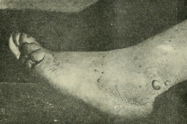 The present illness commenced about three years before, when he chanced to wound the sole of his right foot with a nail. A pedunculated growth, about the size of a cherry, arose from the wound. This description reminds one of the strawberry-like granulation tumours sometimes growing from small wounds or ulcers on the fingers, which have been termed “botryomycosis,” or rather “botryomycomata,” because at one time they were supposed to be caused by the “botryomyces.”[2] The growth was removed by a doctor. Afterwards small bluish nodules developed from time to time on the feet and legs. Some of these nodules apparently undergo the following series of changes: They slowly increase in size, and after about 136three months constitute little pendulous tumours, which ultimately fall off spontaneously or else are knocked off or pulled off by chance; in this way local healing occurs, but fresh nodules form elsewhere. Though, as stated, some of the nodules become pedunculated growths, others appear to atrophy and merely leave brownish pigment in the skin, whilst others seem to undergo very little change, and, at all events, persist for a long time in their primitive form, namely, as hard bluish lumps under the epidermis. Treatment has been as yet without result.