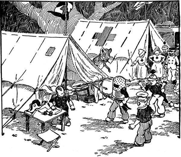 The first day’s march was very hard on the soldiers, for the sun was hot and the little fellows were not used to such long tramps. When the order came for the army to break ranks and make camp ready for the night, the soldiers worked with a will unloading the wagons and putting up the tents. The kitchen tent was put up first so the Cook and the Chinaman would lose no time in getting dinner ready for the hungry army.