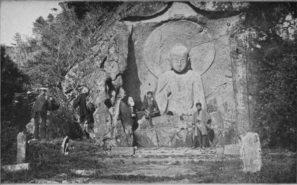 One thing, however, still remains at Kamakura to tell us of its unrecorded past. It is the world-renowned statue of Buddha,—one of the largest works in bronze that man has ever made. Upon a huge stone pedestal, in the form of a lotus-flower, one hundred feet in circumference, this monstrous figure has been seated here in solemn contemplation for seven hundred years. It is a noble representation of the man before whose shrines more knees are bent in prayer to-day than before those of any other founder of religion whom this earth has known. Close by, beneath the trees, are pedestals of enormous columns, the relics of a splendid temple which once formed the canopy of the statue, but which was swept away by a huge tidal wave, four hundred years ago. The statue itself, however, was too immense and weighty to « 41 » be thus destroyed; hence, as it sits here now in solitary grandeur on a plain, beneath which sleeps a vanished world, the only columns that surround it are majestic trees, the only roof that shelters it is the arch of the immeasurable sky, and the only tapers on its ruined altar are the unchanging stars.