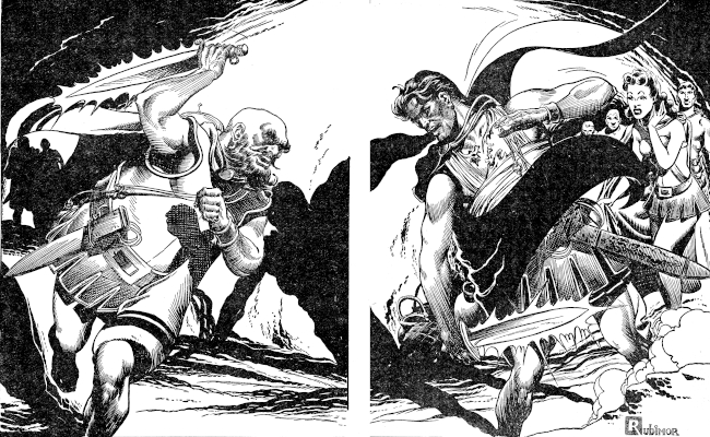 They fell back, quickly and orderly. Of a sudden I found myself in that big cave, and Gederr before me, no more than twenty paces distant. He held his ray-saber, glowing and ready, in his right hand. In his left was some sort of silvery cylinder. He grinned murderously.