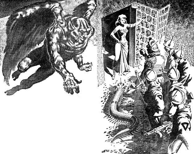 Knots of wary policemen and determined security soldiers invaded the rooftops and began searching the hundreds of square miles. In case the escaped prisoners had descended from the high levels, even business blocks were being turned out. The whole city was undergoing systematic scouring. Officialdom was desperate and badly frightened. Mechanical trackers had already been sent for. Never before had they been used so early in the game. The man, or whatever he was, Bat Ferris must be found at once, slain if possible. The hunt was on, full cry.