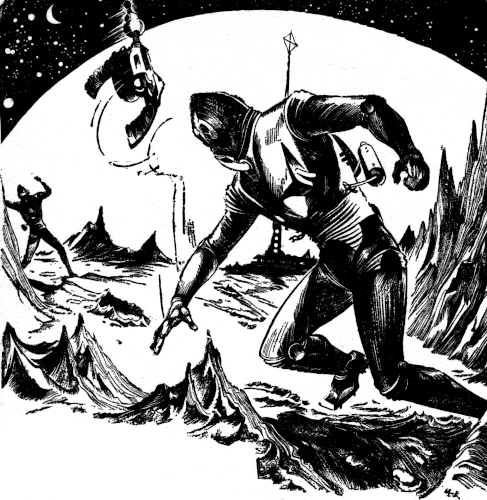 Berne kneeled at the top of the ladder, took careful aim, and squeezed the switch of the heavy rifle. The rocket flame lanced out. Just behind the fleeing figure, and to the side, the rocket mushroomed in a brief blinding flare. Berne could see the glint of the face-plate as Hervey turned his head. He fired again, and cursed the weak light as he overshot. The running figure wavered, looked back, started again toward the safety of the station air lock—toward the radio that could call Mars Base, that could tell the story of murder....