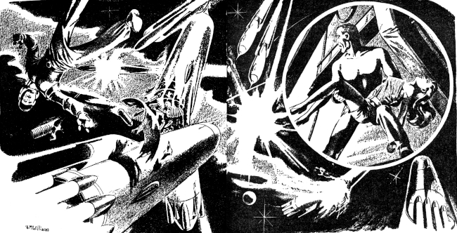 Glayne lunged, flinging the extra spacesuit to one side. Bro-Doral alerted instantaneously, but his Cardy wavered for a fraction of an instant toward the empty space suit. Before he could recover his mistake Glayne's flying body had struck him. The two went down together in a thrashing tangle. Glayne's movements were hampered by the bulky spacesuit and he felt his desperate grip on the Delban slipping. Out of the corner of his eye he saw Bro-Doral extending his long fingers for the Cardy which he had dropped. Frantically he sought to restrain the Delban's long arm, missed, and saw the Delban slither from his grasp and reach for the gun.