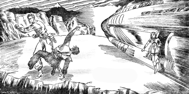 Arms interlocked, they went hurtling from the airlock to the black table of lavalike rock. The smashing jar of collision wrenched their bodies apart. For a moment the pirate seemed about to flee, and Rufus would have let him go. Then the beady eyes fastened upon the space cruiser, and he came for Rufus swinging. One of them would go back to earth with the girl. Frenchy Logrieux didn't intend to spend the rest of his life as a castaway.
