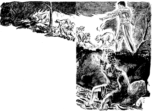 The clamor of the pursuing dogs had drawn close. Now their lithe shapes came bounding out of the deepening shadows. They splashed across the stream, leaped forward with triumphant buglings. Fangs were bared, muscles gathering for the attack.