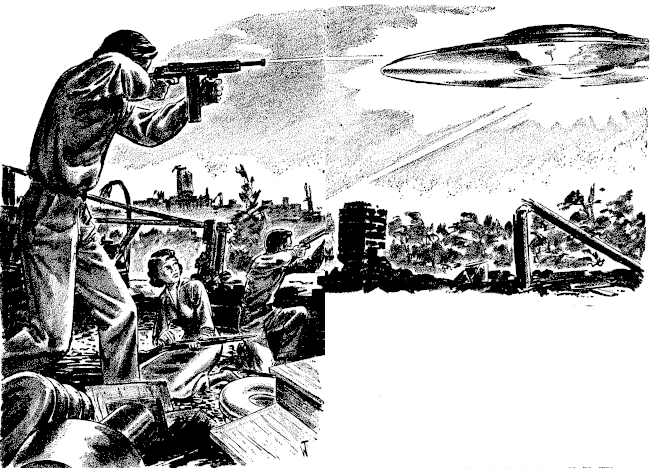 "Anyhow, in the early '40s we gave you the atom bomb, nuclear fission, that is. And the radiations of those first bombs went out across the great spaces, and twelve years later were detected and analyzed on Tlonis by the astronomers. Uncle's bunch got in an uproar, as we'd known they would, and piled into ships and started out for Earth. We couldn't help that; we'd had to give you fission. We figured we had enough time. We started disk construction and we began to build an invincible army out of your men, by raying them with the painkilling and telepathic rays. We miscalculated the time it would take Uncle to get here. We wanted to meet him in space or bypass him and get to Tlonis with our gang. Maybe, we thought, he wouldn't have connected the atomic explosion with us, anyhow. But he did, and knew we were preparing to invade Tlonis, and he came.