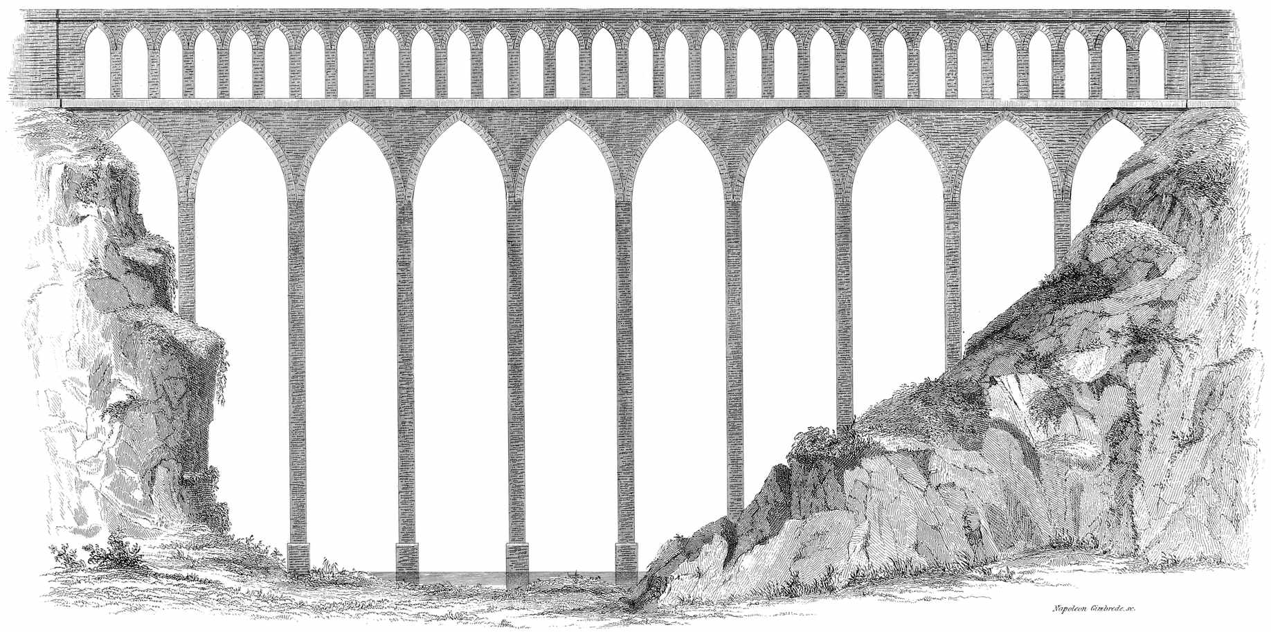 A view is given of the Aqueduct of Spoleto, in Italy. The bridge supporting this Aqueduct is remarkable for the slender form of the piers and their great height; being only ten and a half feet thick and two hundred and fifty feet high to the base of the arches. This Aqueduct was built by the Goths, a people who gave a model for Church Architecture which is much admired at the present day. It is said that they borrowed the idea of the form of their arch from the opening beneath an arbor of trees.