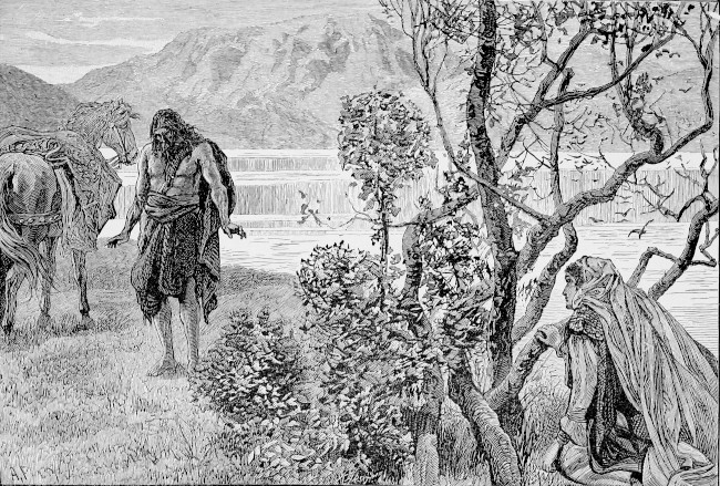 "Upon this I became anxious and sorrowful; and, when the man perceived it, he said, 'If thou wouldst rather that I should show thee thy disadvantage than thine advantage, I will do so. Sleep here to-night, and in the morning arise early, and take the road upwards through the valley until thou reachest the wood through which thou camest hither. A little way within the wood thou wilt meet with a road branching off to the right, by which thou must proceed until thou comest to a large sheltered glade with a mound in the centre. And thou wilt see a black man of great stature on the top of the mound. He is not smaller in size than two of the men of this world. He has but one foot, and one eye in the middle of his forehead. And he has a club of iron; and it is certain that there are no two men in the world who would not find their burden in that club. And he is not a comely man, but, on the contrary, he is exceedingly ill-favored; and he is the woodward of that wood. And thou wilt see a thousand wild animals grazing around him. Inquire of him the way out of the glade; and he will reply to thee briefly, and will point out the road by which thou shalt find that which thou art in quest of.'