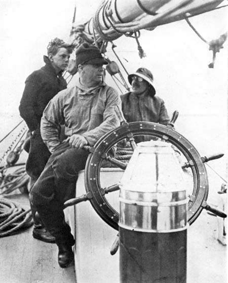 We were flying on around Scateri wafted southward by a fair wind. But as we neared Halifax the wind hauled to the southwest and swept upon us with a force unparalleled by any hurricane that even the Commander had ever seen. It was far worse than any through which we had previously passed. In an astonishingly short time the surface of the sea was a series of steep and treacherous ridges which struck us from every side. Luckily the mainsail had been taken in before dark, but the foresail and jumbo were still up. The Commander immediately despatched Melkon and Dick Salmon to take in the jumbo, while he gripped the wheel. I was busily engaged in rescuing the loose articles on deck when suddenly a towering sea crashed over the bow, and leaving the wheel to me the Commander dashed forward to the aid of the two men there. I seized the wheel and put her hard over to hold her bow in the wind. The engine was running full blast. The force of the wind and the sea was so great that the vessel was literally pushed backward and began shipping seas over the stern.