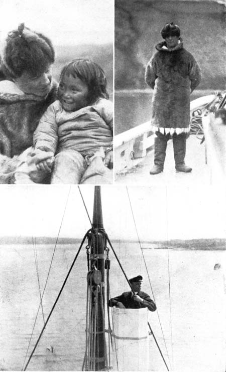 Under starlit skies and unruffled sea; in the semi-darkness of his 10-11 watch, I watched him[xi] as he stood at the wheel “giving her a spoke” now and then to keep her on her course, his small sheepskin-covered form outlined against the black of the ocean. In howling winds and with the Bowdoin plunging and bucking head seas, decks awash and life lines stretched, the same huddled form, eyes on the compass card, doing his best, with never trace of quit, I, a shipmate for four months, knew him. Young Rawson made good. For that reason he goes back again with me in the Northland one week from to-day, back to the big grey hills of Labrador with their outlying, breaking reefs, to the inner reaches of its green bays, to its simple, sincere people; to Greenland, once the home of the Norsemen, now the land of the Dane and smiling half-breed; to Baffin Island, the Meta Incognita of Martin Frobisher, the objective of many an old New England whaling ship.
