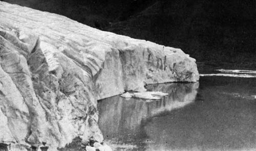 [122]After we left Cape York, the midnight sun was with us no longer, and we had darkness for the first time in over a month. It indeed seemed strange to see the icebergs again bathed in a sunset flush, gleaming in the distance like old Greek temples of delicate pink marble. As twilight shaded into darkness and the stars blossomed once more in the heavens, we sat long on the quarter deck drinking in the infinite beauty of the night, silent save for the murmur of the water beneath the prow.