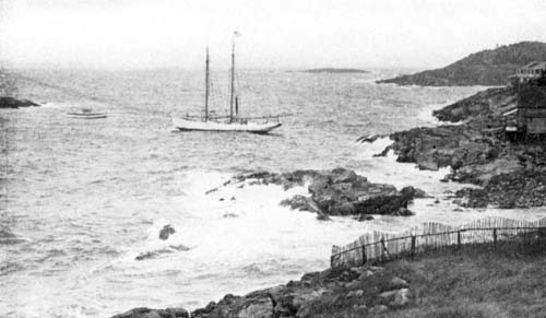 We had hoped to make an early start on Saturday morning for Wiscasset where we were expected by many of our friends and well-wishers. But at three o’clock in the morning we were awakened by the shrill scream of a storm humming through the rigging. This storm later developed into the great gale of October 10th, known to every fisherman on the coast. We did not, however, immediately despair of being able to make the run to Wiscasset. When we roused[139] out at breakfast time the wind had shown no sign of abating, and one look out to sea sufficed to demonstrate that any thought of departure that day was but an idle wish. I put my head above the level of the hatch and glanced about. The vessel was wallowing in a heavy swell which came rolling into Dead Man’s Cove from the west. The anchor chain stood out as taut and stiff as a bar of iron. The vessel’s stern tailed dangerously close to the wicked rocks astern which reared their ugly heads through a wall of breaking seas and flying spume. As the morning wove on, the storm increased in violence and our situation became precarious. Twice the sturdy fishermen of Monhegan bucked their way out from the inner harbor to warn us that our anchorage would soon become untenable, and it behooved us to get out while we still could. Eventually our stern approached within a few feet of the rocks, and the Commander decided we should have to go around the island into the inner harbor. To take the vessel out in the teeth of that roaring hurricane with a bent propeller such as we had, was a feat not lightly to be undertaken.