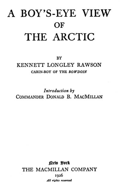 TO the lecturer the introduction is the most interesting part of his lecture, in that it is generally so complimentary that his feeling of guilt and a sense of his own inferiority mars somewhat his whole discourse. My cabin boy, Kennett Rawson, suffers no handicap in this respect. His work is finished. Whatever I may write will not affect its status. His narrative stands as a testimonial of the influence of good and much reading. Very few will believe that such language is natural for a fourteen-year-old boy. But we knew “Ken” in the forecastle of the little Bowdoin, and teachers at Hill School who have watched his progress for two years can assure you that the book is his own.