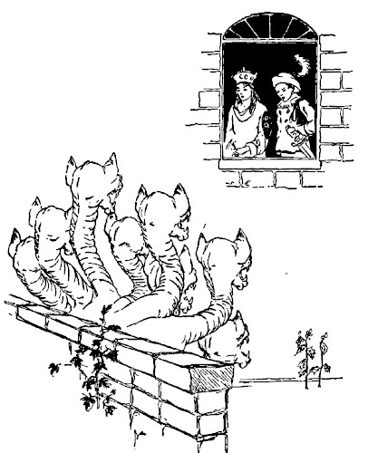 Now a twenty-headed Gallopus is shaped like a star with twenty points, and on each point is a head. And each head has two pop eyes, two big ears, a wide mouth with a complete collection of long, sharp teeth, and a turned up nose. And when a twenty-headed Gallopus wishes to show a person that he does not care for his society, he turns slowly about and stares at him fixedly with his forty eyes, which makes a person feel very uncomfortable. So you can easily imagine how Ting felt when he reached the enchanted castle and confronted the twenty-headed Gallopus in the courtyard.