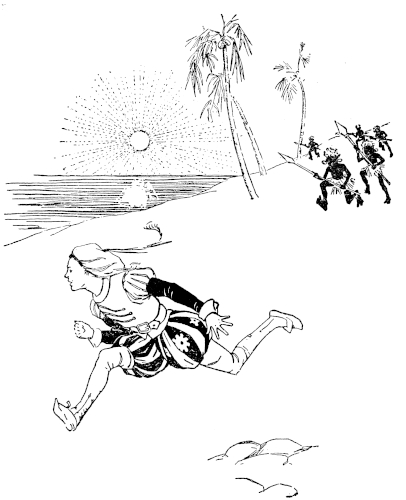 All of which showed what a silly old thing the twenty-headed Gallopus was, for he might have known that Ting would not stop running around. Indeed, he ran so fast that the monster finally stopped and stood panting with his forty cheeks all puffed out. And then it was that the Princess leaned out of the window, extended her hand, and Ting, giving a leap, seized it and jumped in at the casement where she sat.