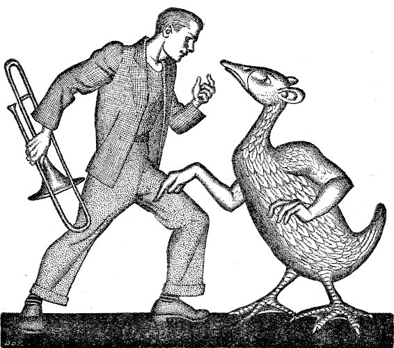 And then one day Ogroo says to me, "Mac, I am happy to tell you that we have located the object which you call a trombone. One of the men took it and has had it hidden. He feared it was a thing of evil power. I assured him it was not, though I was not so sure myself. I hope that I was correct."
