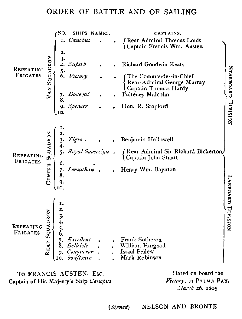 | Order of Battle and of Sailing, signed Nelson and Bronté, dated March 26, 1805 | [Pg xiv] 132 |