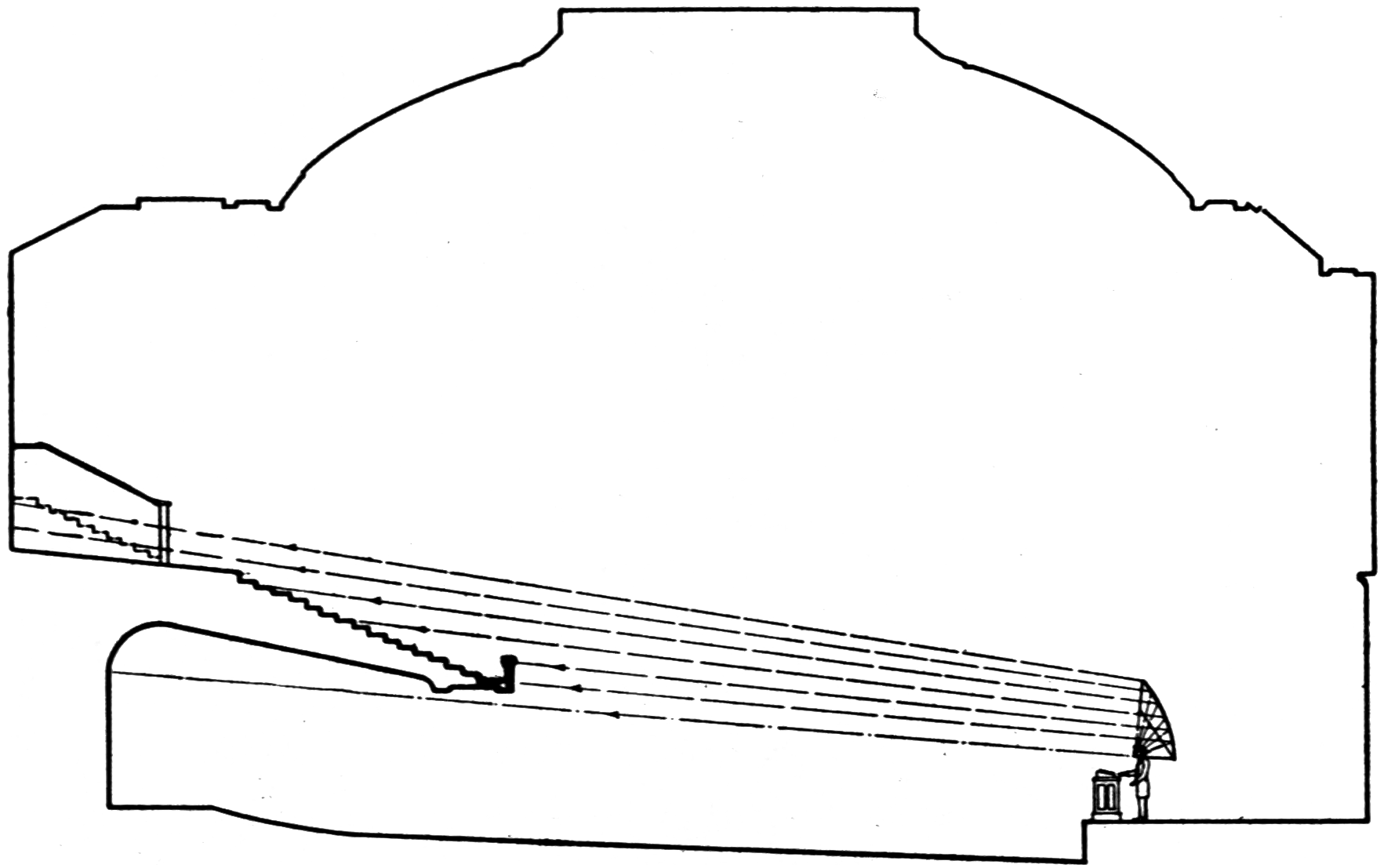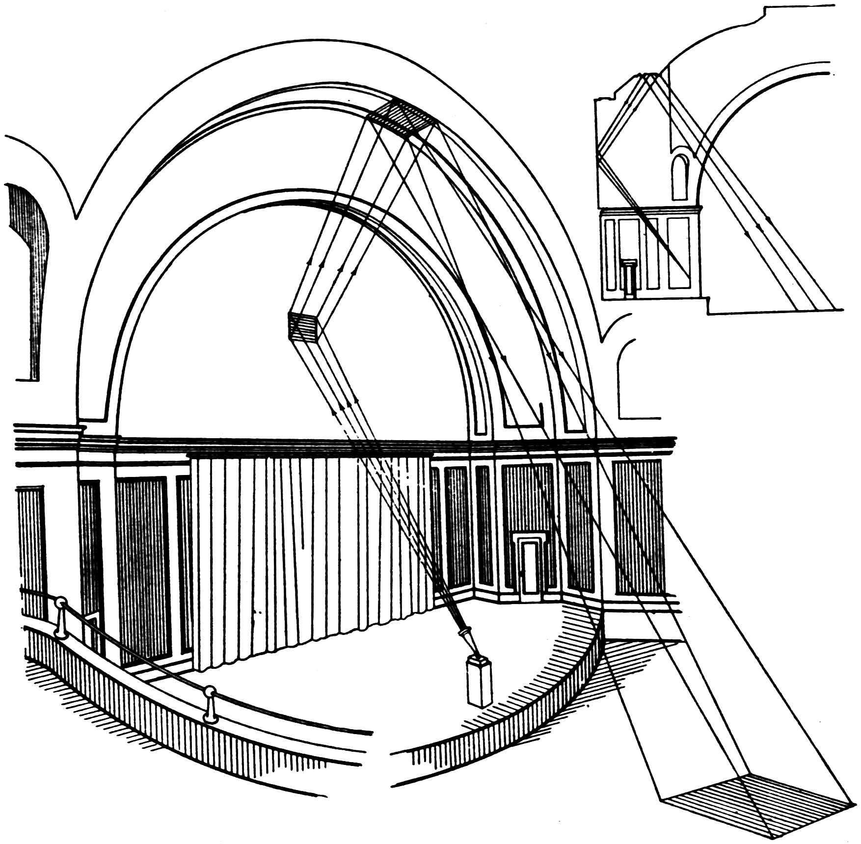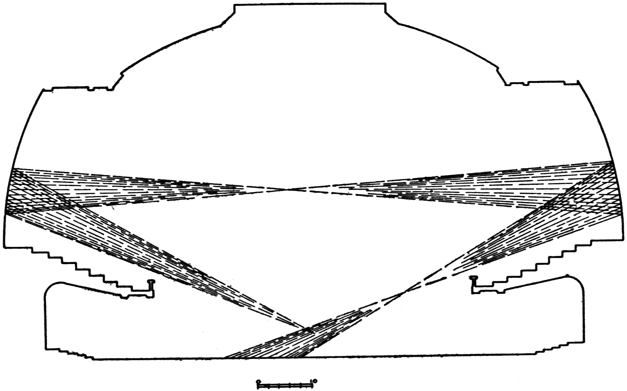 A square bundle of sound starts from the stage and strikes the spherical surface of the dome. After reflection, it is brought to a point focus, as shown, and spreads out until it strikes the vertical cylindrical wall in the rear of the balcony. This wall reflects it to a line focus, after which it proceeds to the stage. Auditors on all parts of the stage complained of hearing echoes.